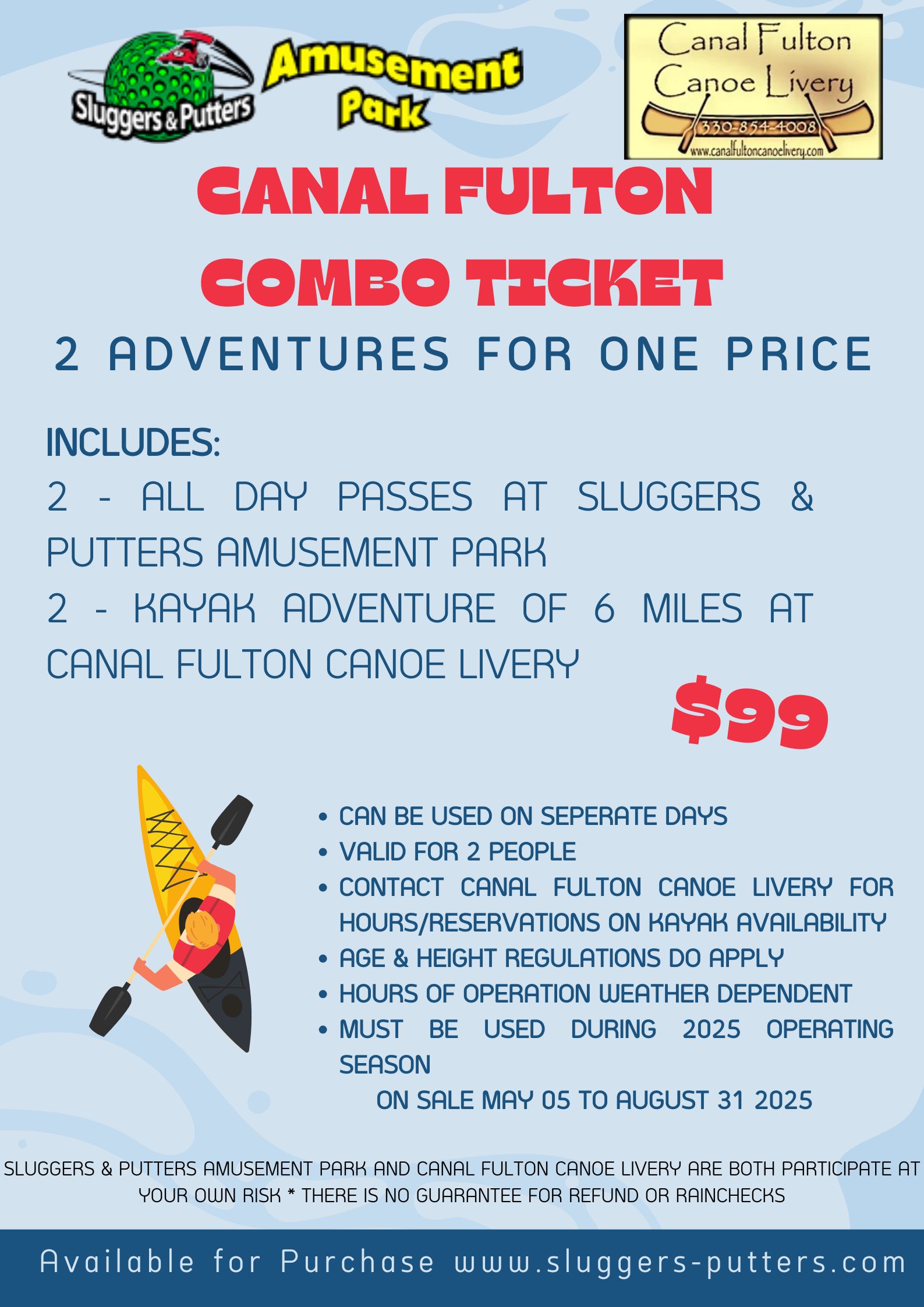 SLUGGERS & PUTTERS AMUSEMENT PARK AND CANAL FULTON CANOE LIVERY ARE BOTH PARTICIPATE AT YOUR OWN RISK * THERE IS NOW GUARANTEE FOR REFUND OR RAINCHECKS